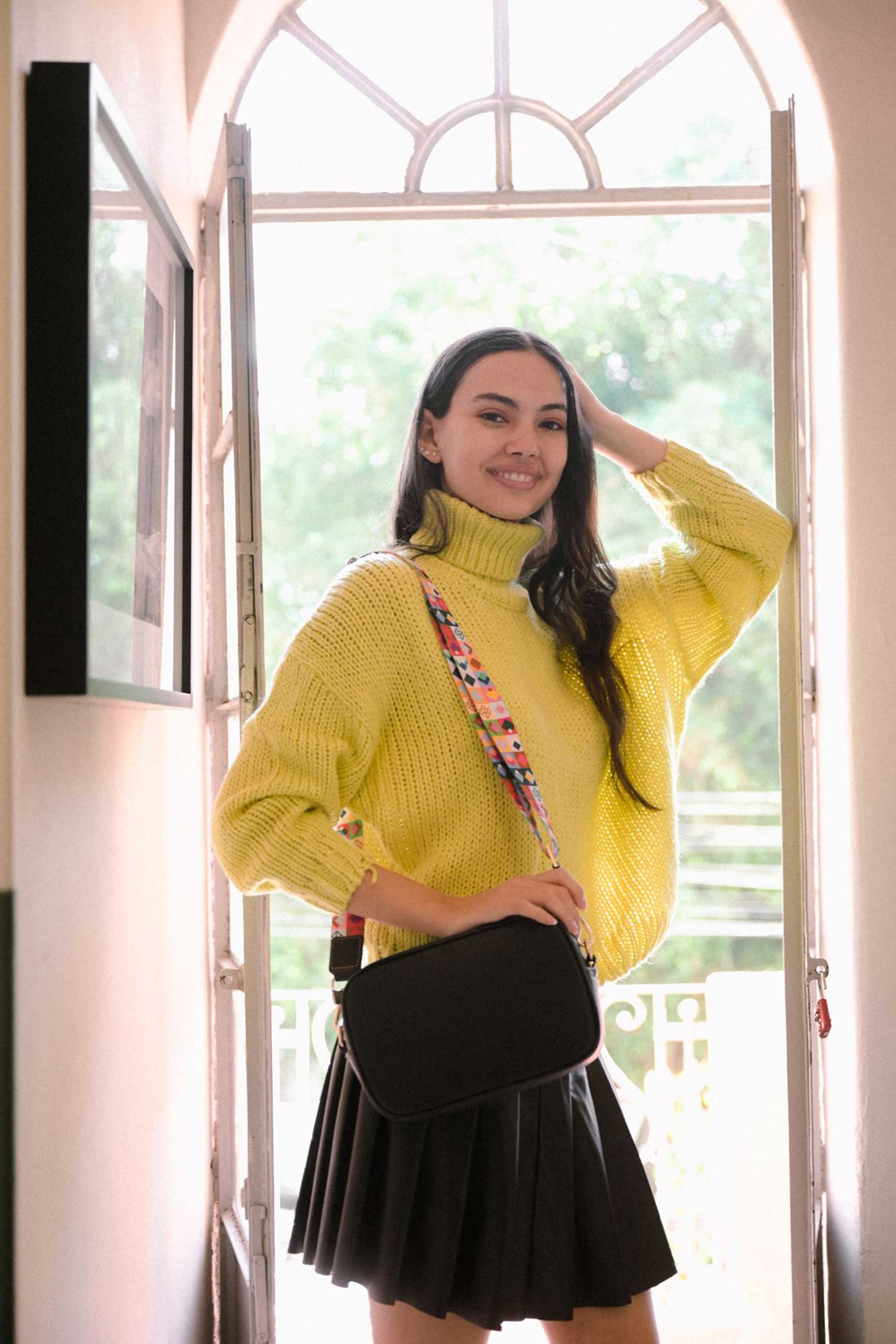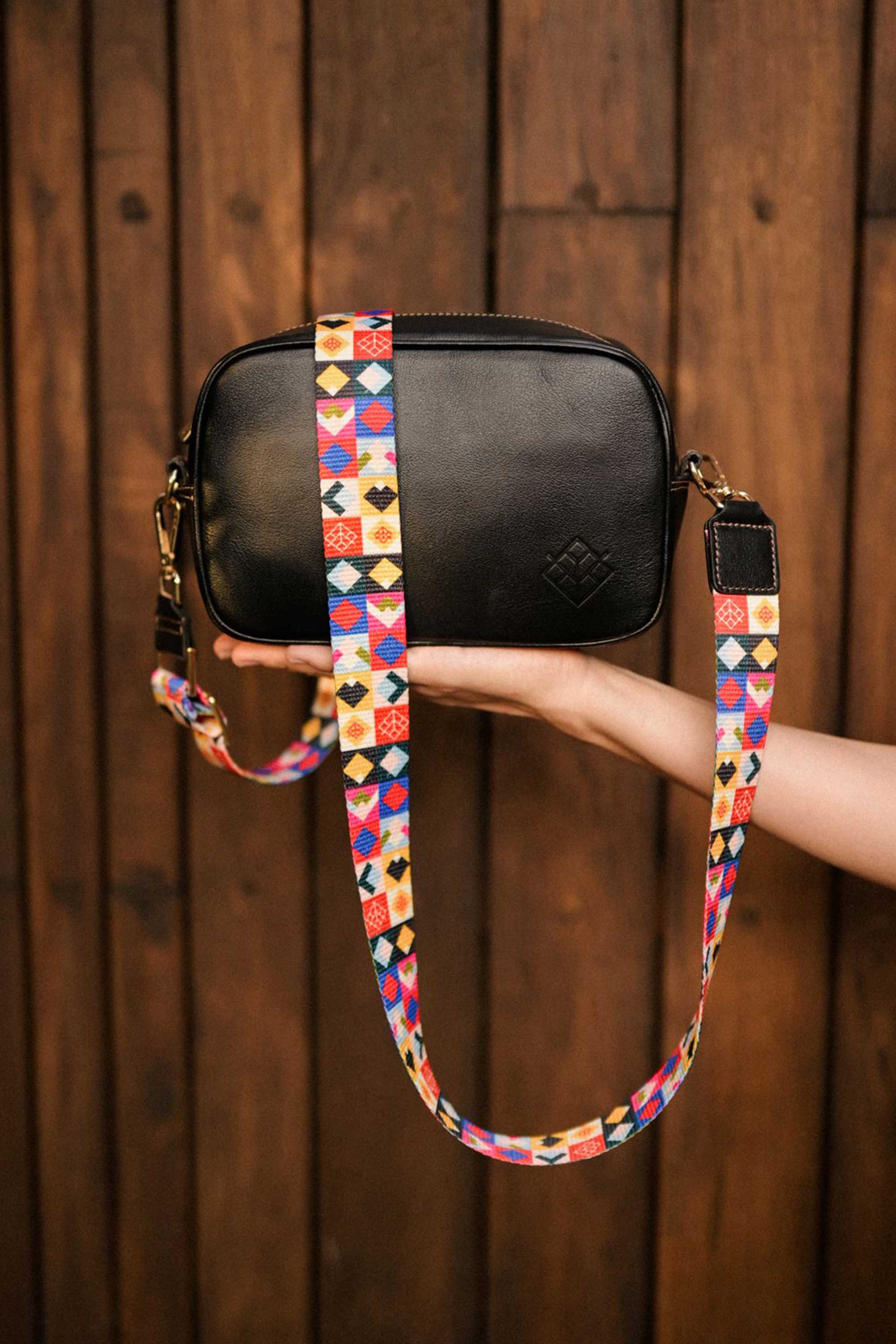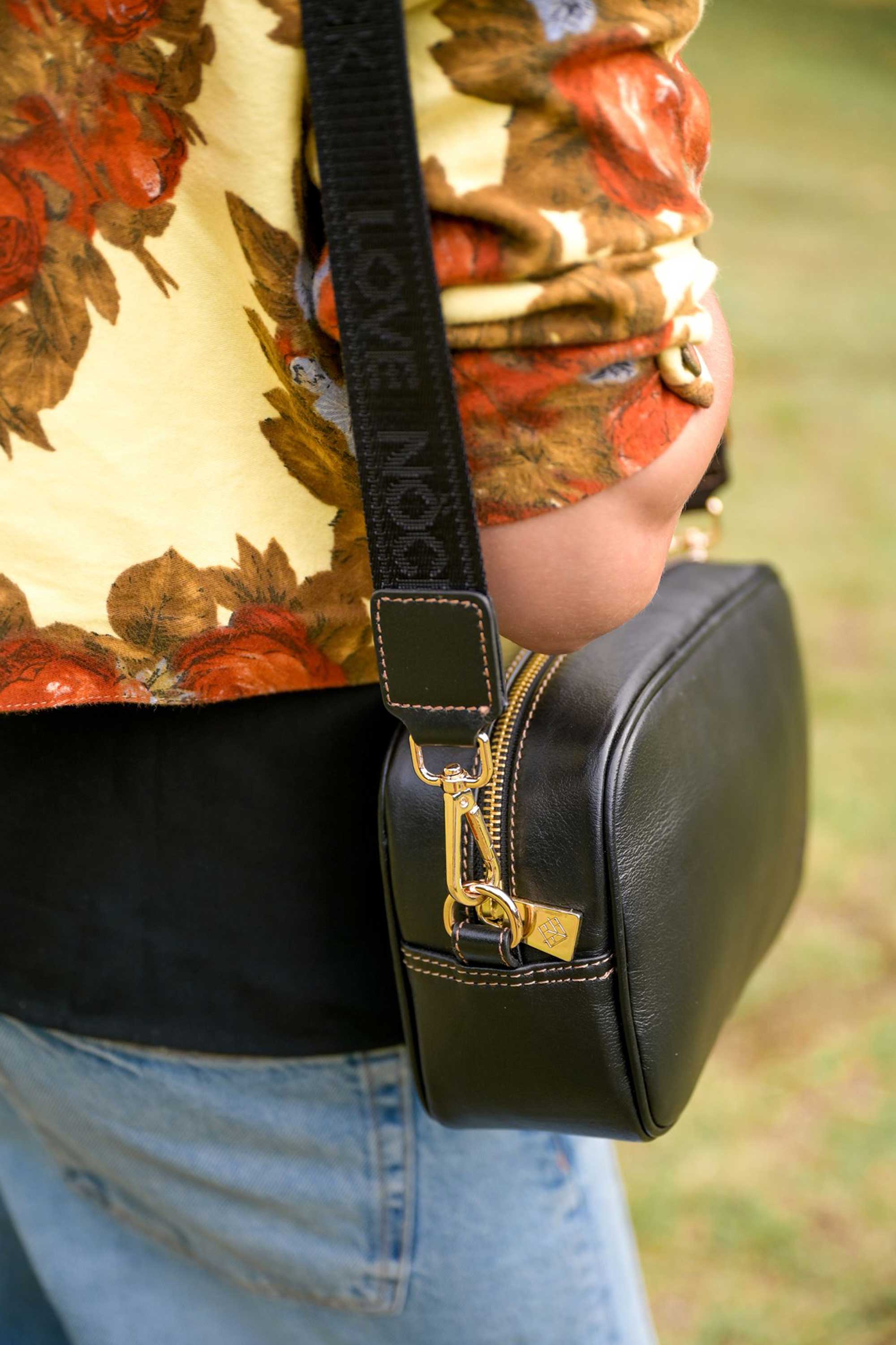 Bolso tamaño pequeño en piel color negro. DOBLE asa bandolera ajustable multicolor con monograma NÖCK.