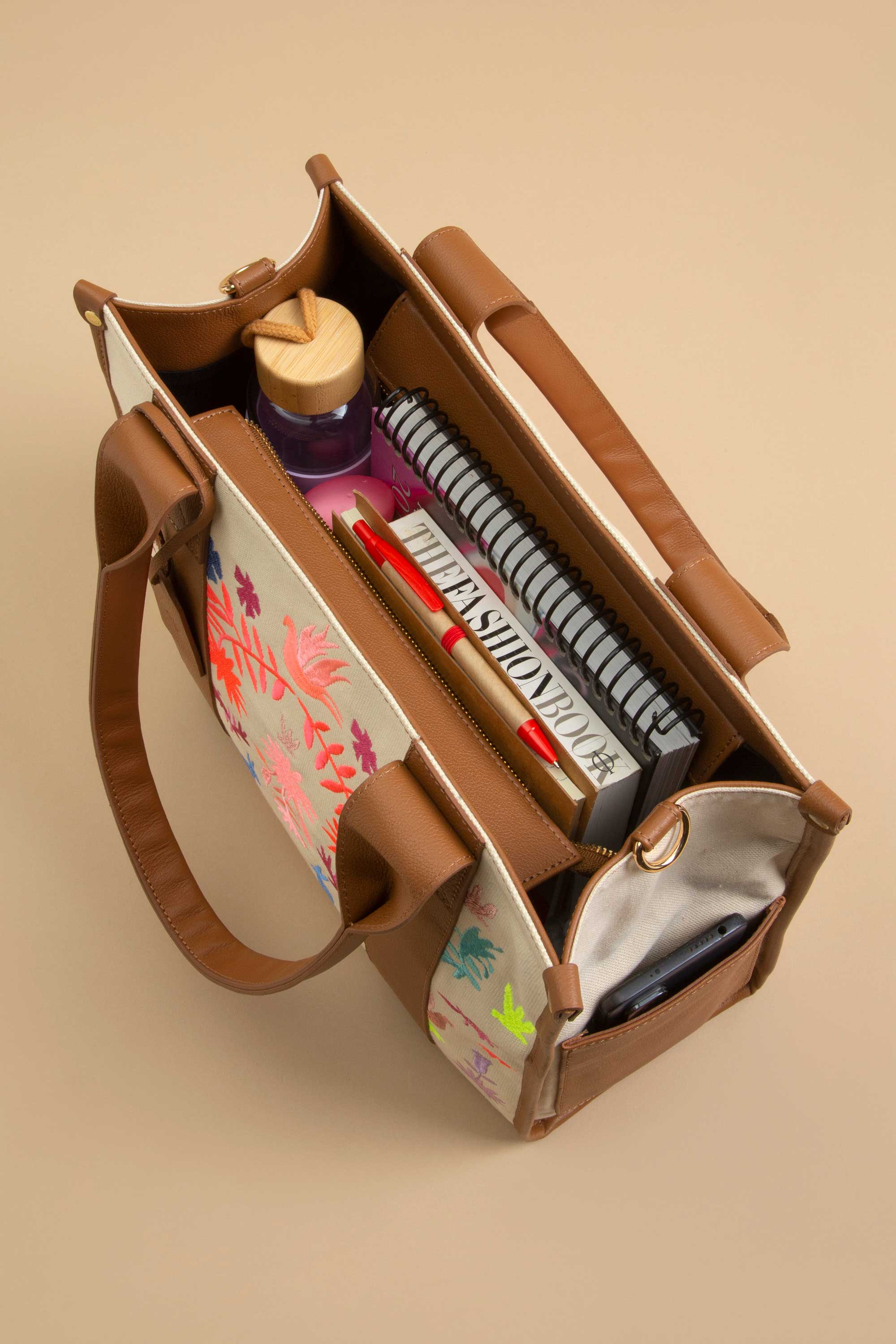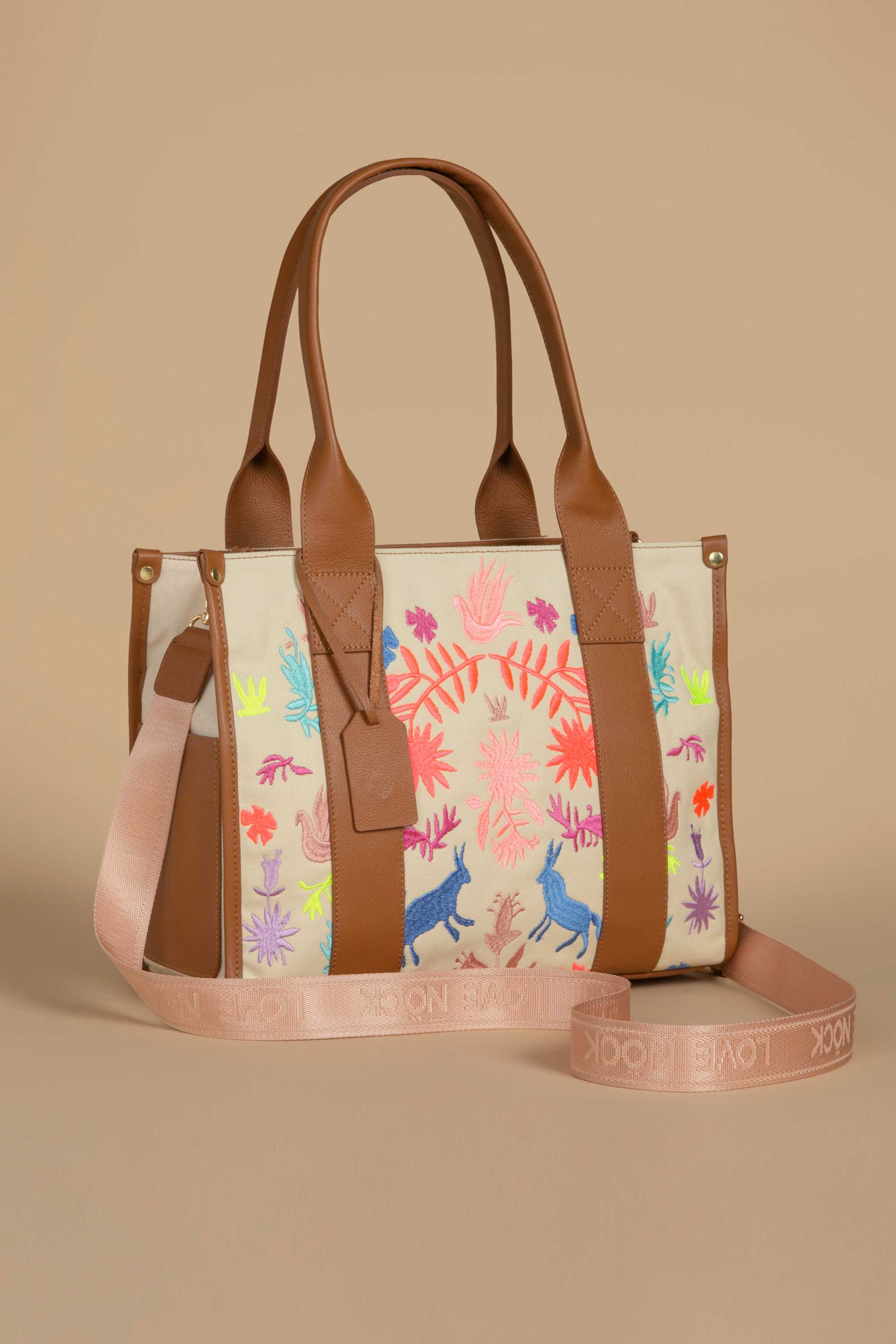 ¡Lleva contigo el estilo único y divertido de la Tote Oaxaca! Con su bello bordado con inspiración y reinterpretación de motivos Otomíes. Es una linda mezcla de pieles y textil, amplitud y con su correa removible, esta amplia y espaciosa tote será tu compañera ideal. ¡Su cierre metálico y toques de color divertidos la hacen aún más encantadora!