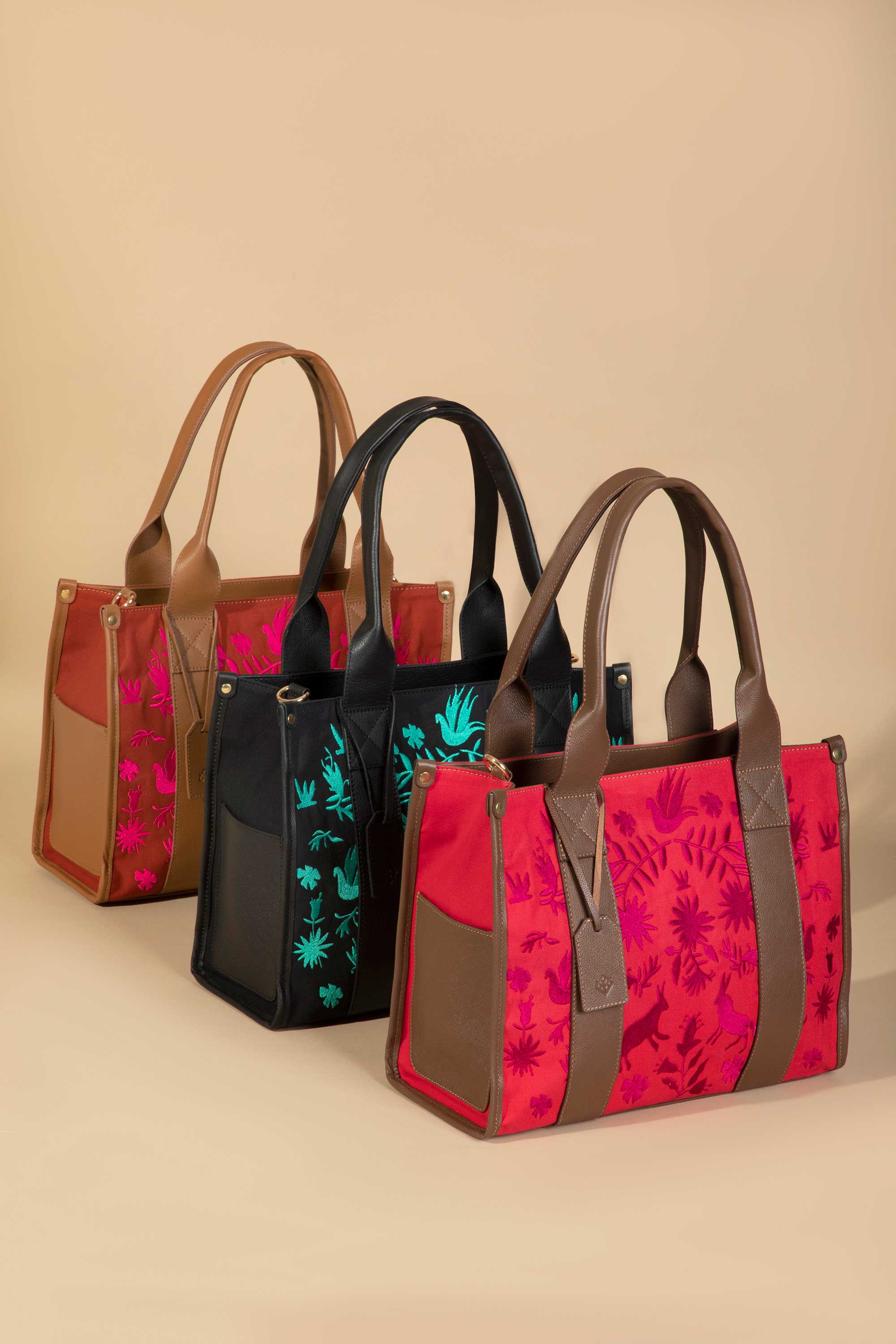 ¡Lleva contigo el estilo único y divertido de la Tote Oaxaca! Con su bello bordado con inspiración y reinterpretación de motivos Otomíes. Es una linda mezcla de pieles y textil, amplitud y con su correa removible, esta amplia y espaciosa tote será tu compañera ideal. ¡Su cierre metálico y toques de color divertidos la hacen aún más encantadora!