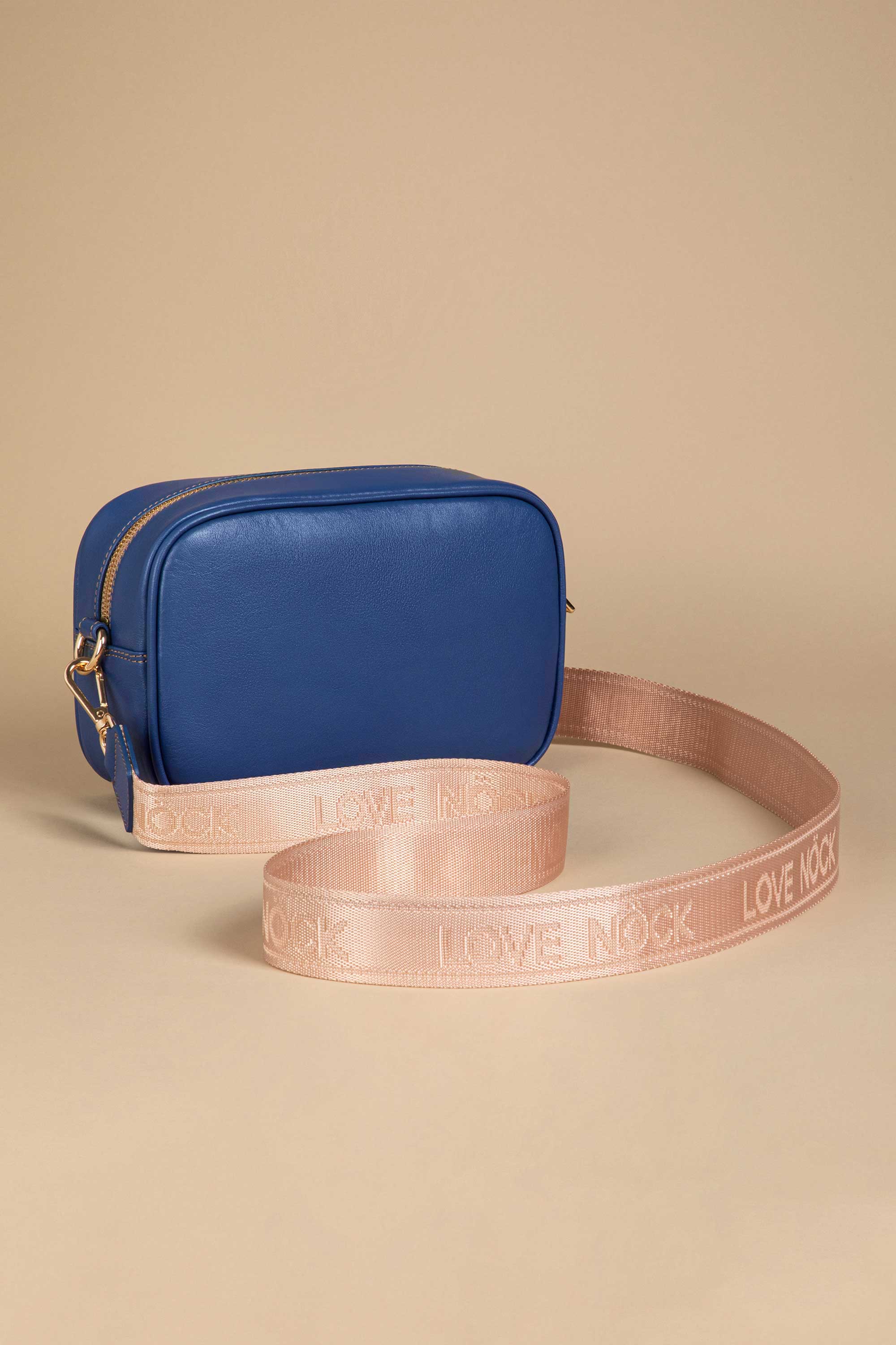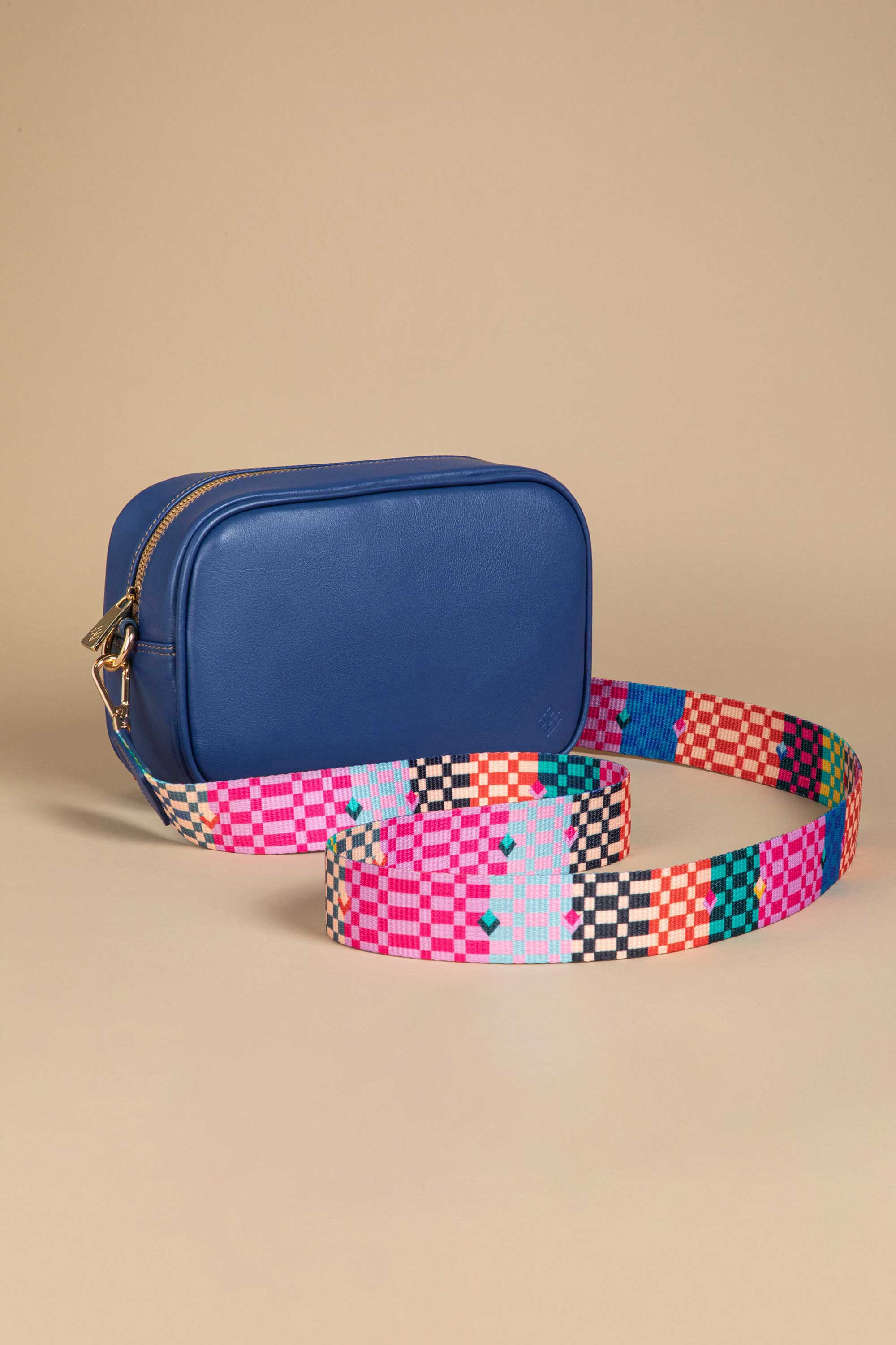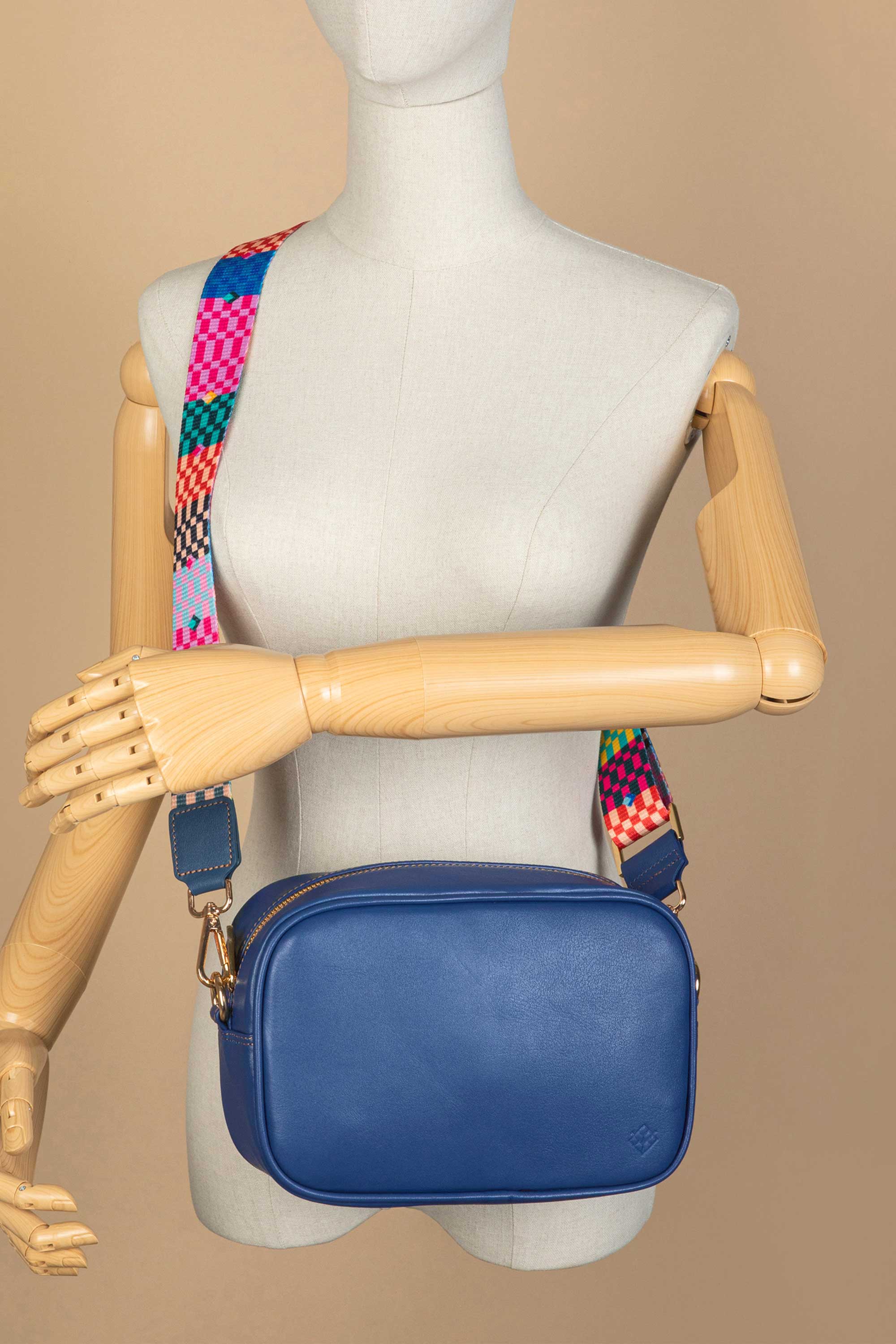 Bolso tamaño pequeño en piel color azul. DOBLE asa bandolera ajustable multicolor con print monograma NÖCK.