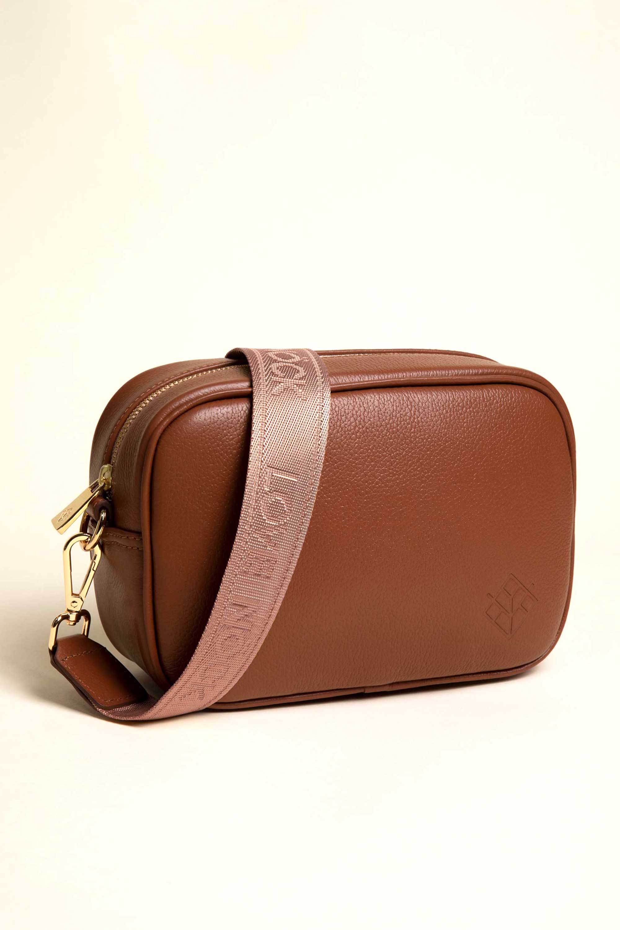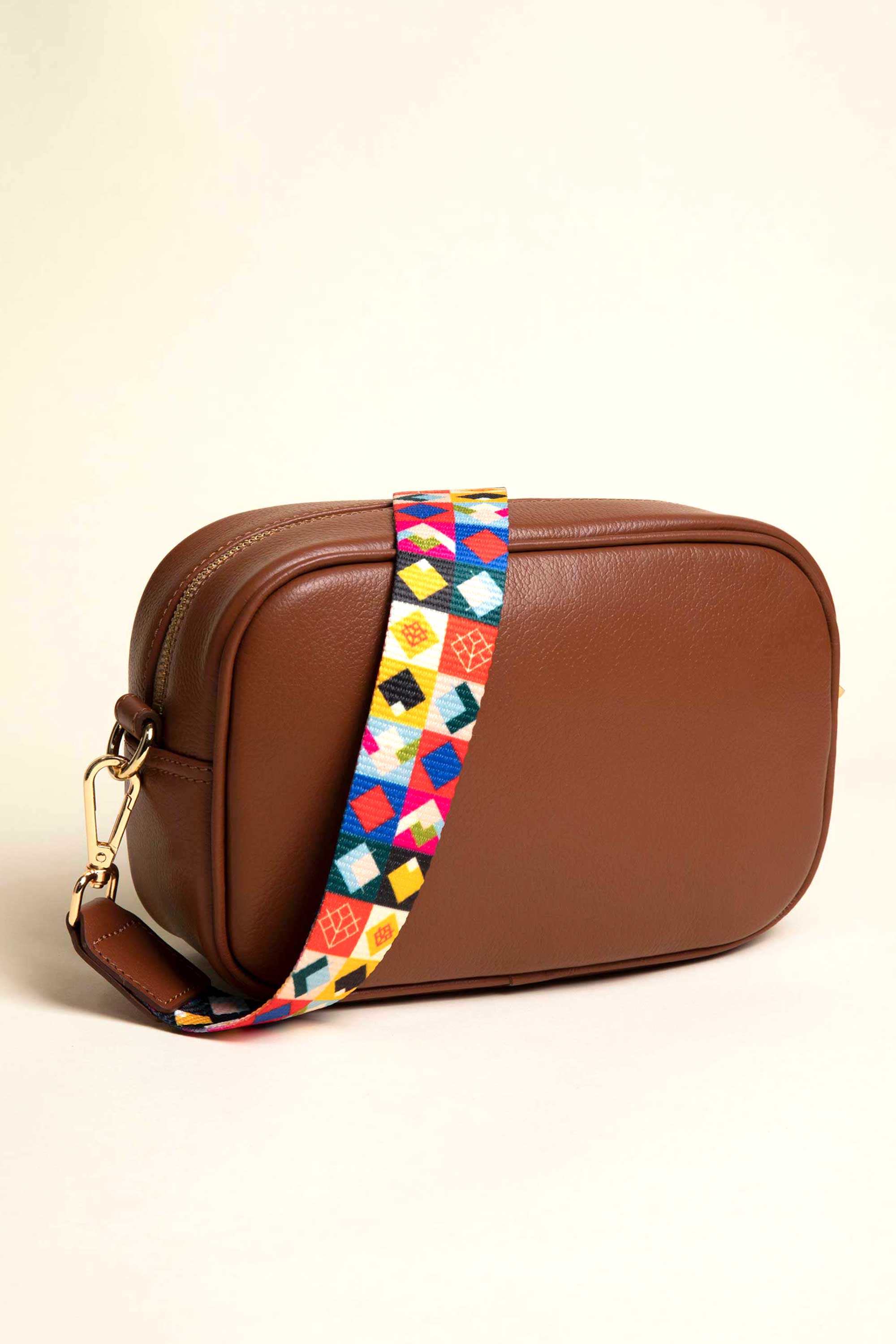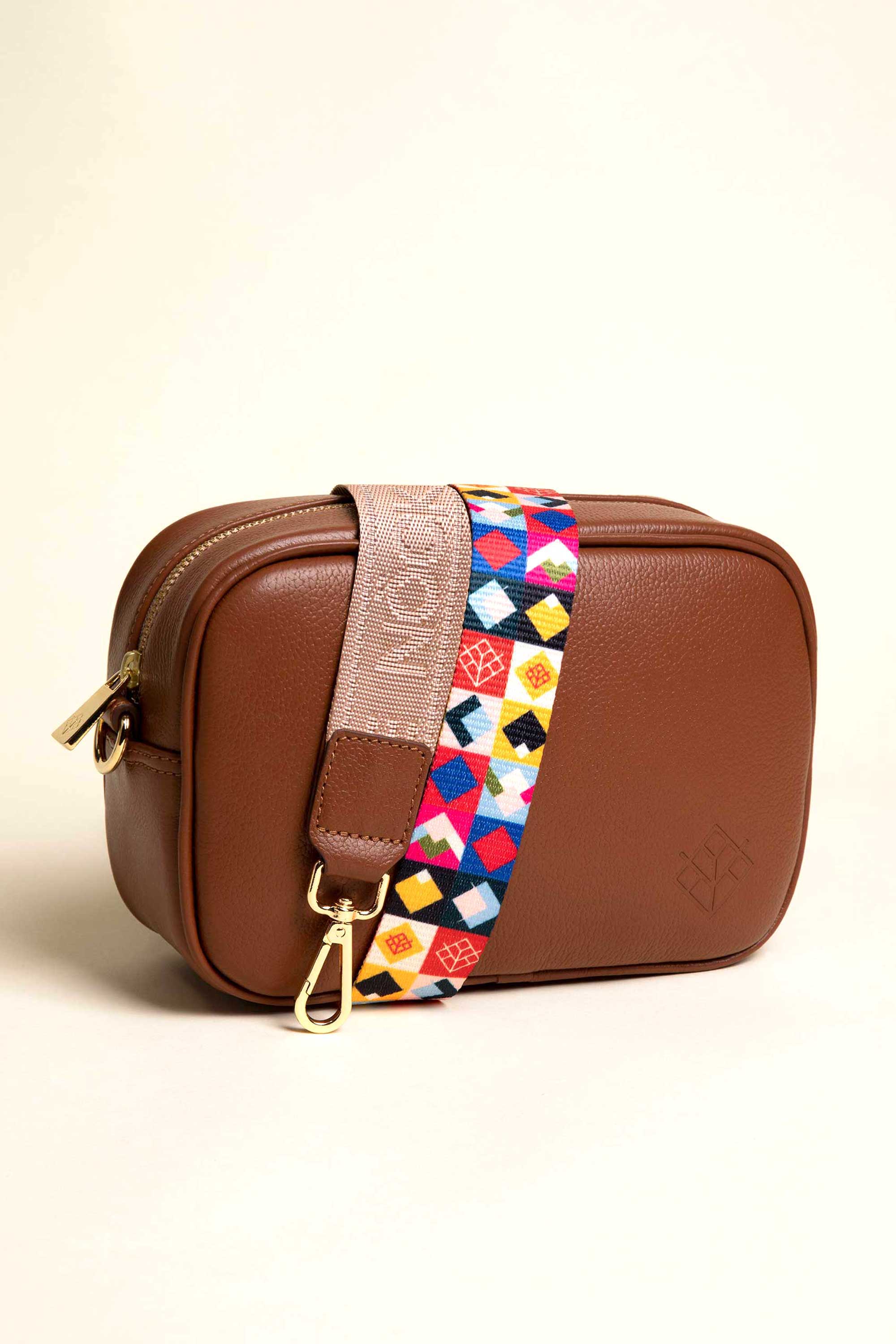 Bolso tamaño pequeño en piel color canela. DOBLE asa bandolera ajustable multicolor con monograma NÖCK y tu segunda correa en tejido.