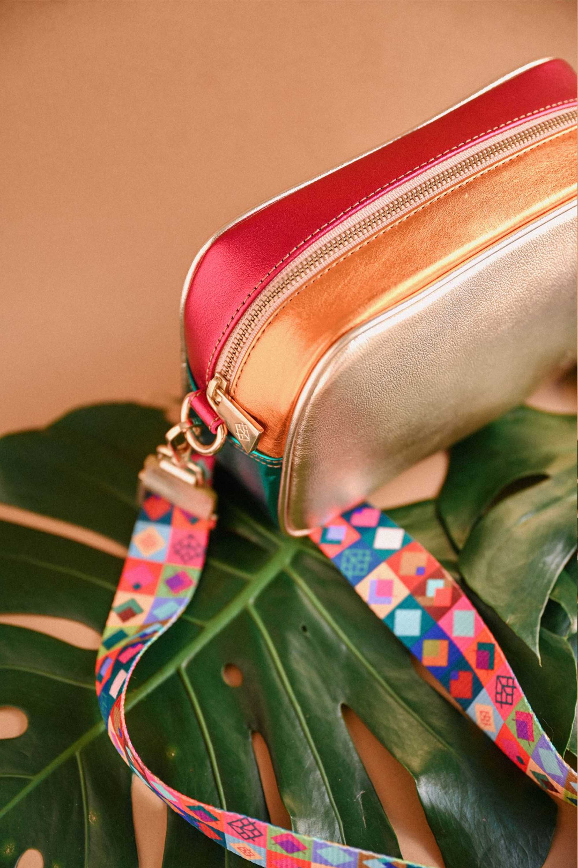 Bolso tamaño pequeño en piel vacuno con divertidos colores metálicos. DOBLE asa bandolera ajustable. Una multicolor con monograma NÖCK estampada y otra tejida en tono liso.