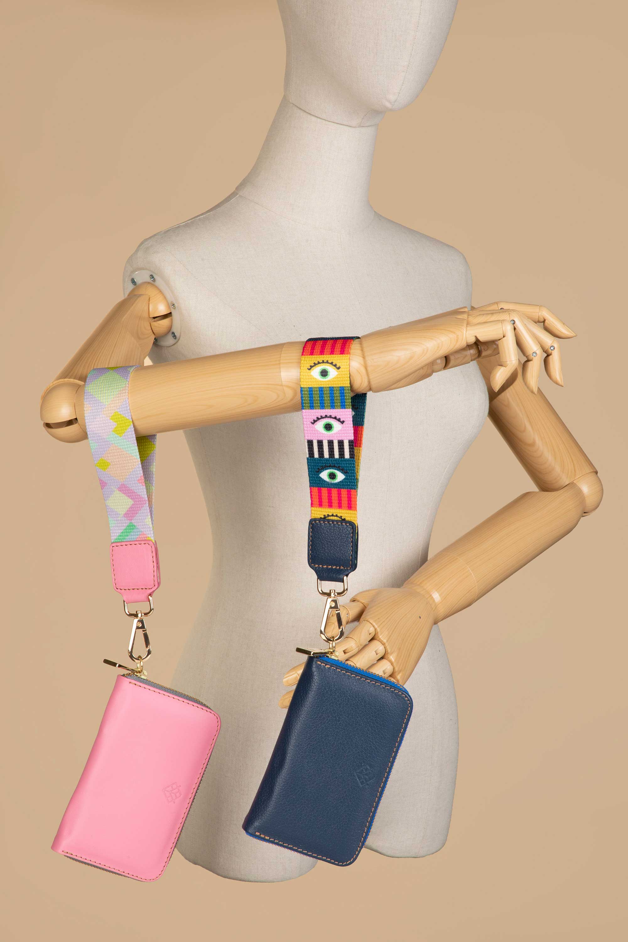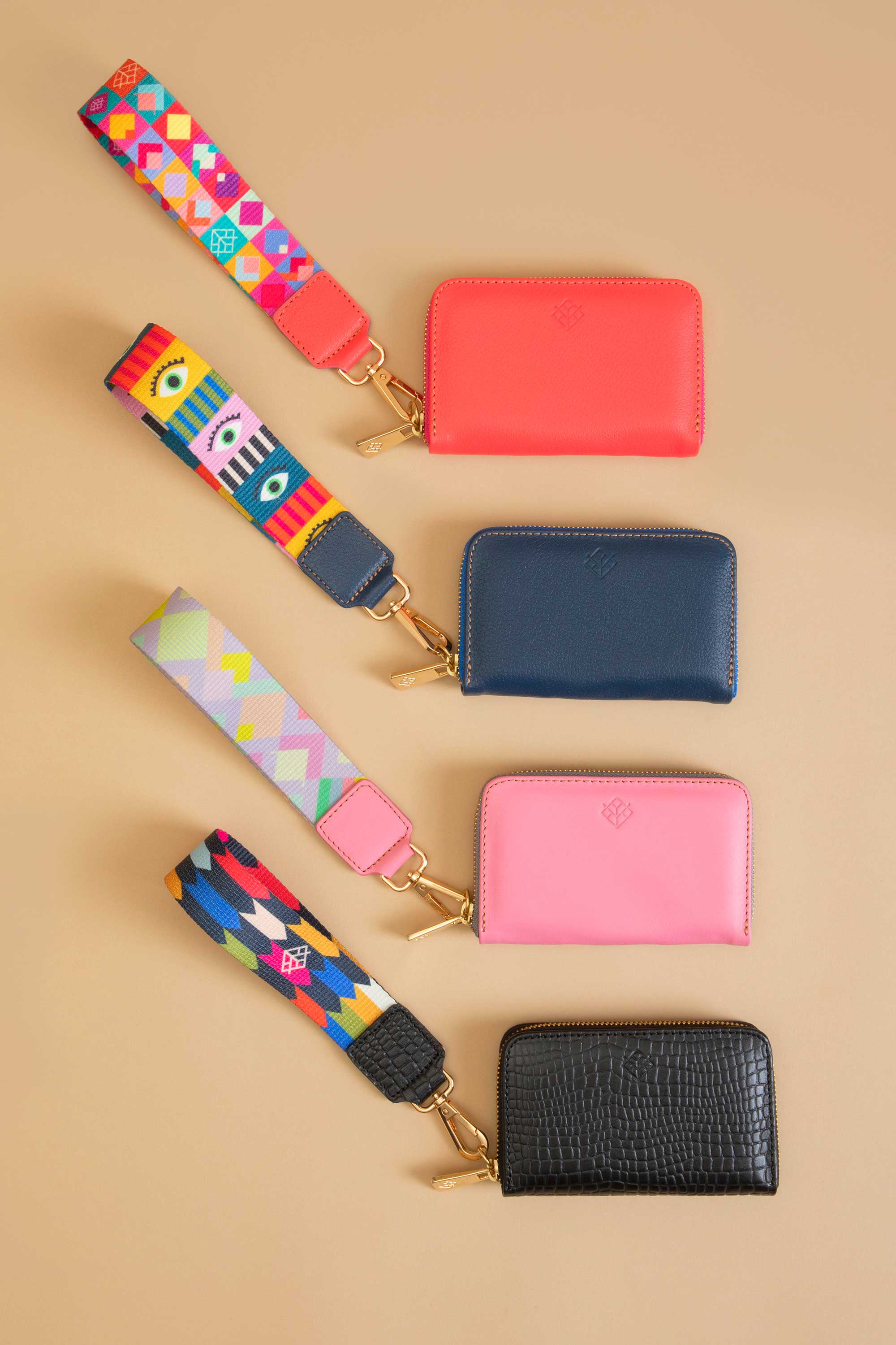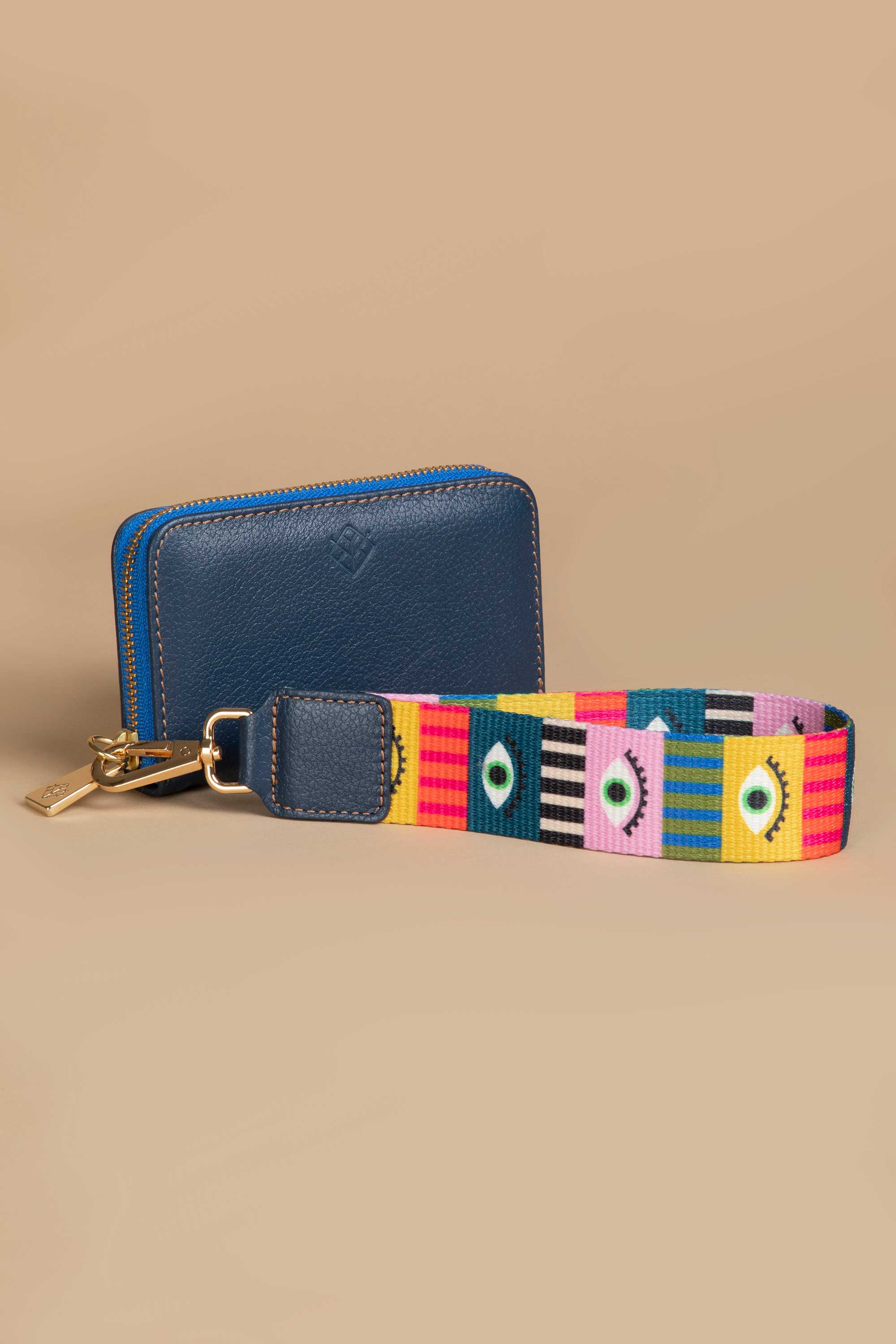 Cartera en piel color azul marino. Pulsera NÖCK multicolor removible para llevarla en la muñeca cuando salgas de paseo. Cierre interno para monedas y espacio para 6 tarjetas.