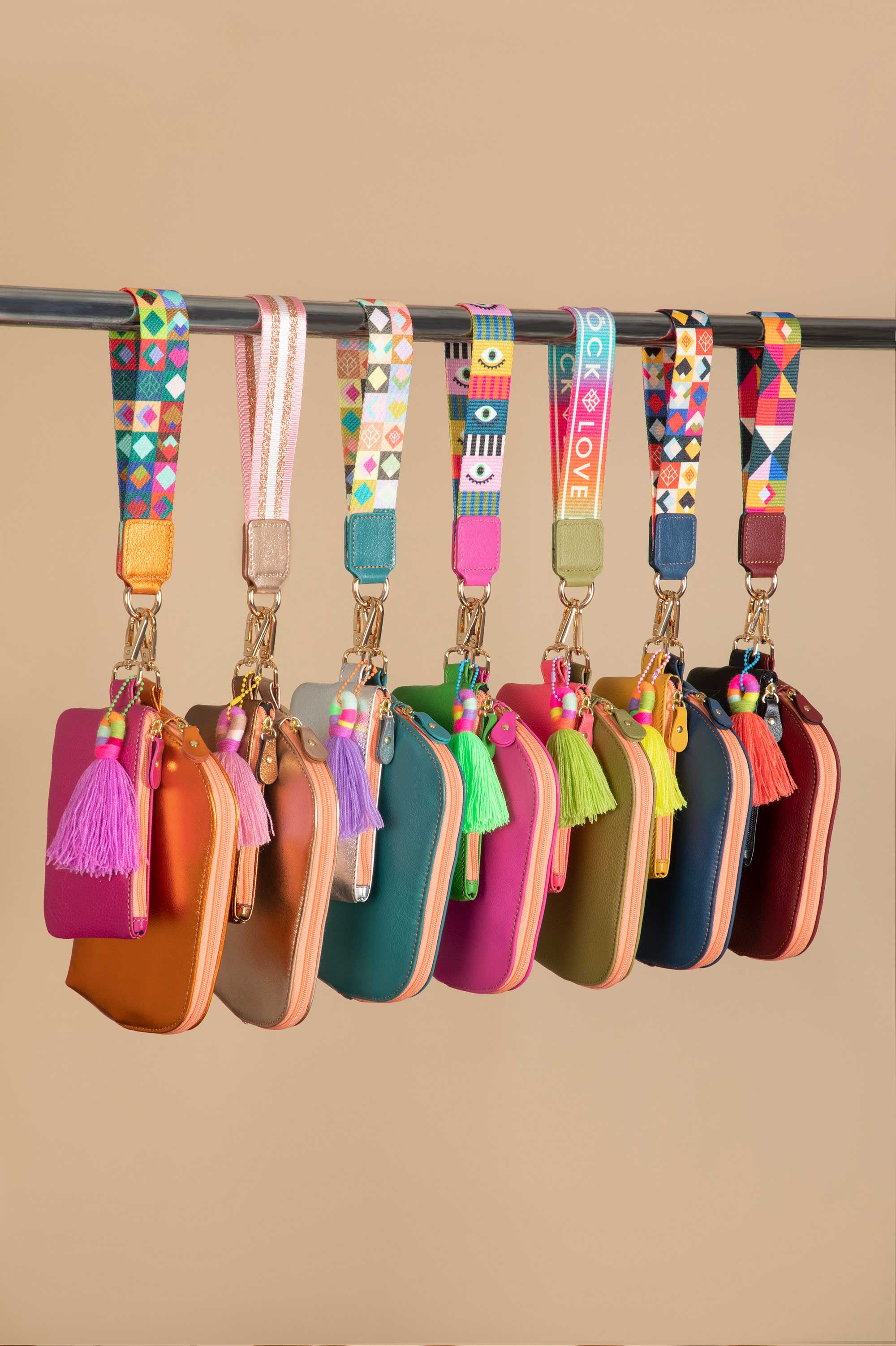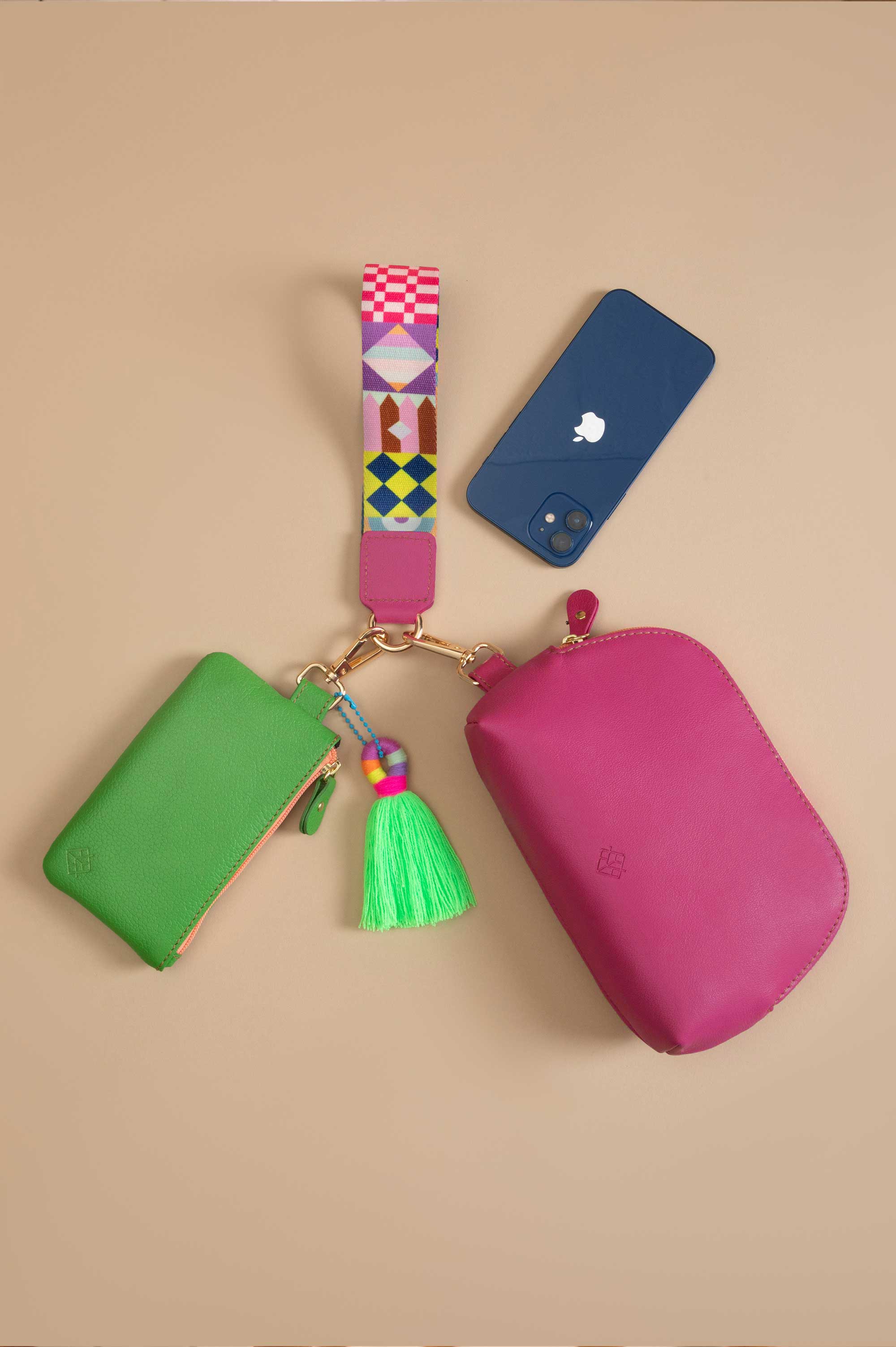 Lleva contigo todo lo que necesitas con nuestra Pulsera Llavero Orquídea. Con 2 cosmetiqueras y una colorida pulsera llavero, puedes llevar tu celular, monedas y tarjetas de una manera divertida y conveniente. Nunca pierdas tus cosas esenciales de nuevo mientras agregas un toque de diversión a tu atuendo.